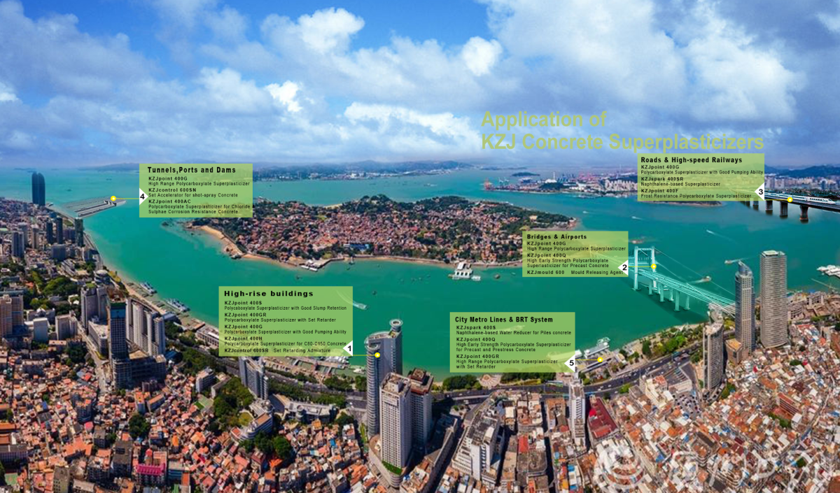 KZJ products are suitable for all types of ready-mixed and precast concrete, from very basic to ultra-high strength, use in the construction of high-rise buildings, bridges, tunnels, high-speed railways, roads, airports, ports, dams, hydraulic & municipal engineerings. Our various concrete admixtures are able to improve strength,setting time, slump retention, appearance and enhance its durability as well. These properties make the concrete placing, pumping and finishing more easily.